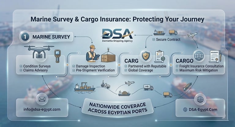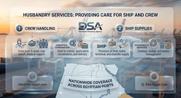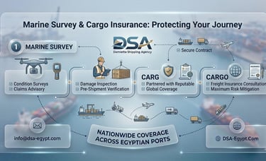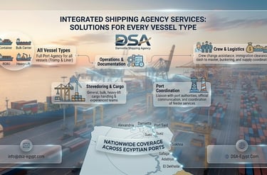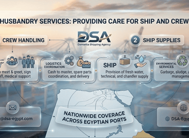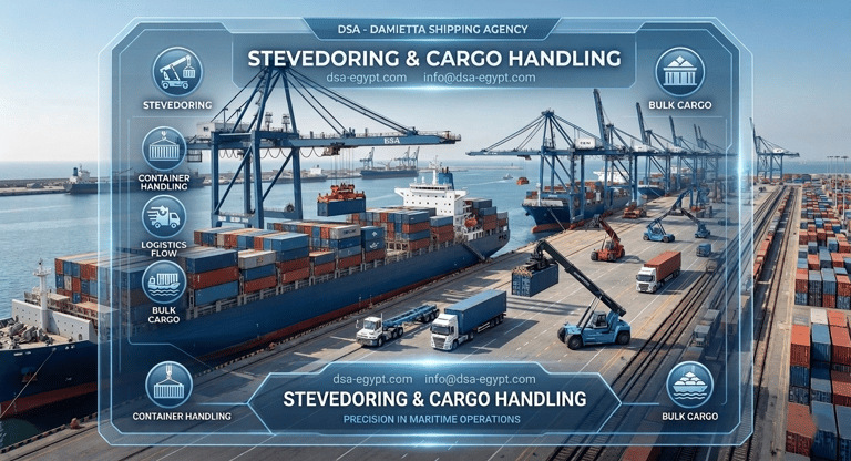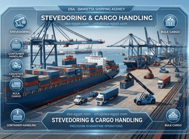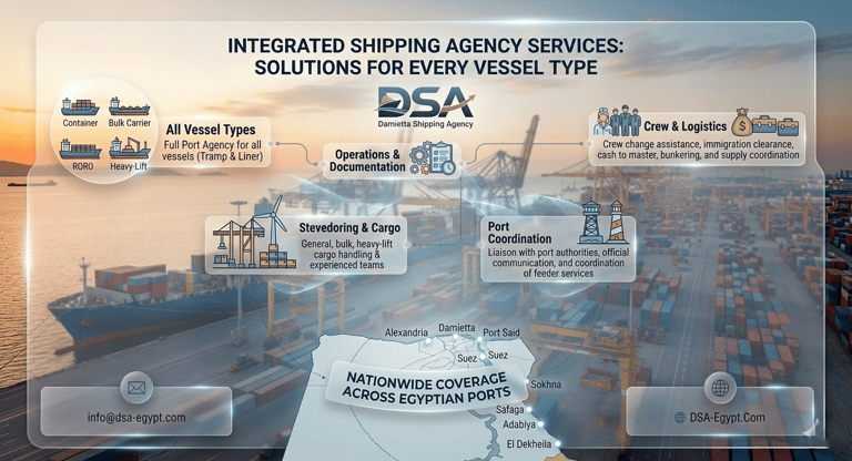 Damietta Shipping Agency offers full shipping agency services, cargo handling, stevedoring, logistics, freight forwarding, and vessel support across all major Egyptian ports.